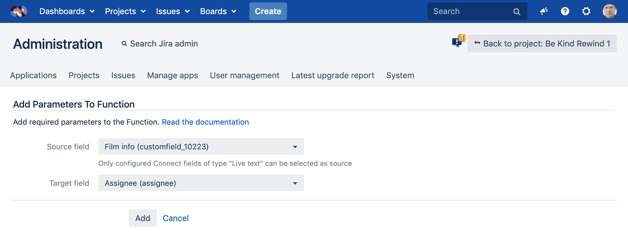 This function allows you to select an Elements Connect Live Text or Live User field whose programmatic content (keys list) will be copied to another issue field.