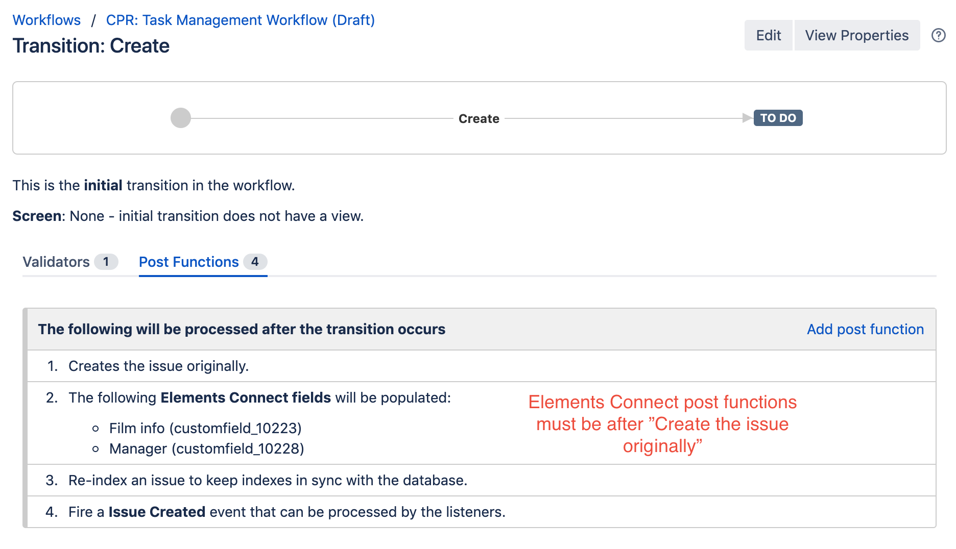 When used in the Create issue transition, Elements Connect post functions must be placed after the Creates the issue originally post function: