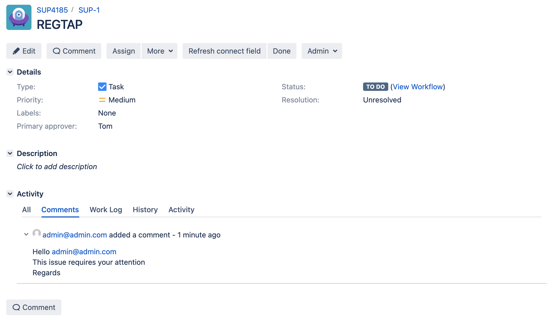 This function allows you to add a comment to the transitioned issue. The comment content will depend on the selected Elements Connect field.