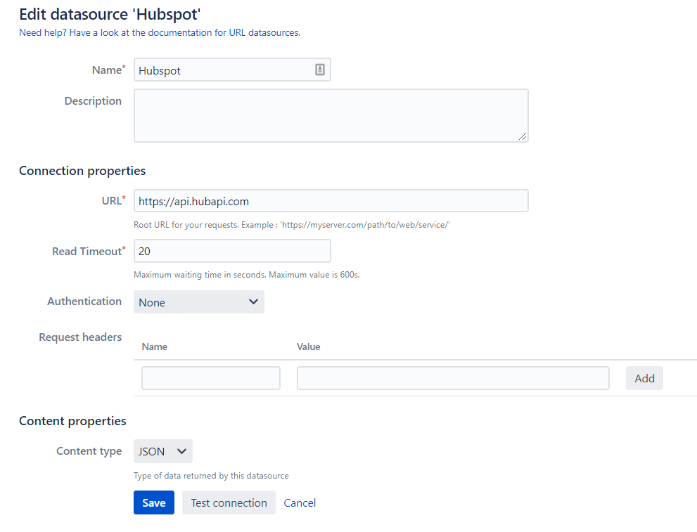 So, to configure the datasource, you only need to specify the base URL on the connection properties (cf. screenshot below) ; the API Key will be added to the field queries using the hapikey= query parameter (detail in the Step 2).