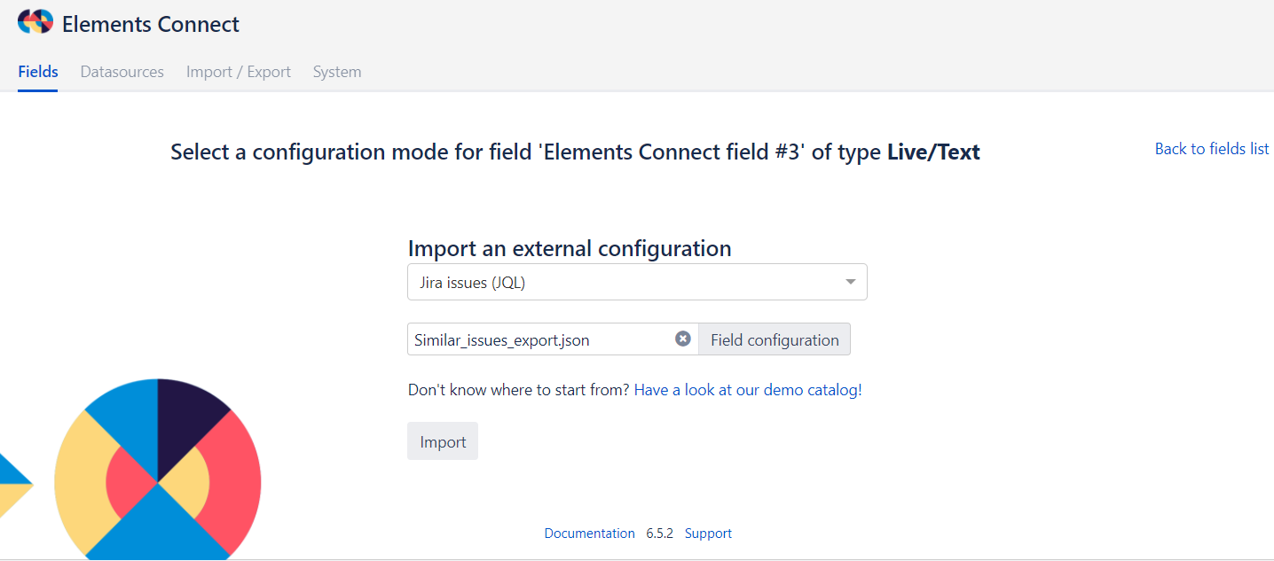 Select the datasource mentioned in the documentation. In our case, it's Jira issues (JQL). Then select the previously downloaded JSON file: