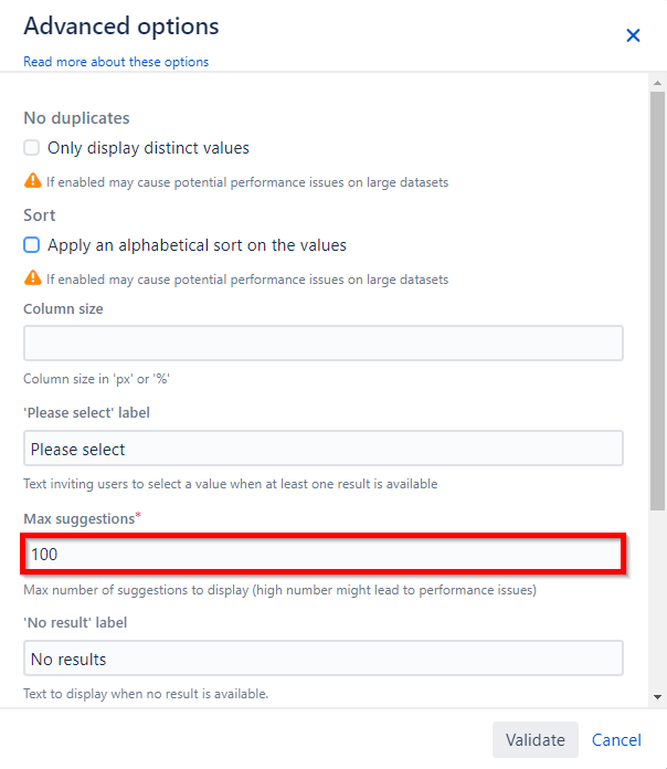 If reducing this option to 100 is problematic and doesn’t allow you to retrieve all the data you need, you should consider using the $userInput variable instead, as explained here.