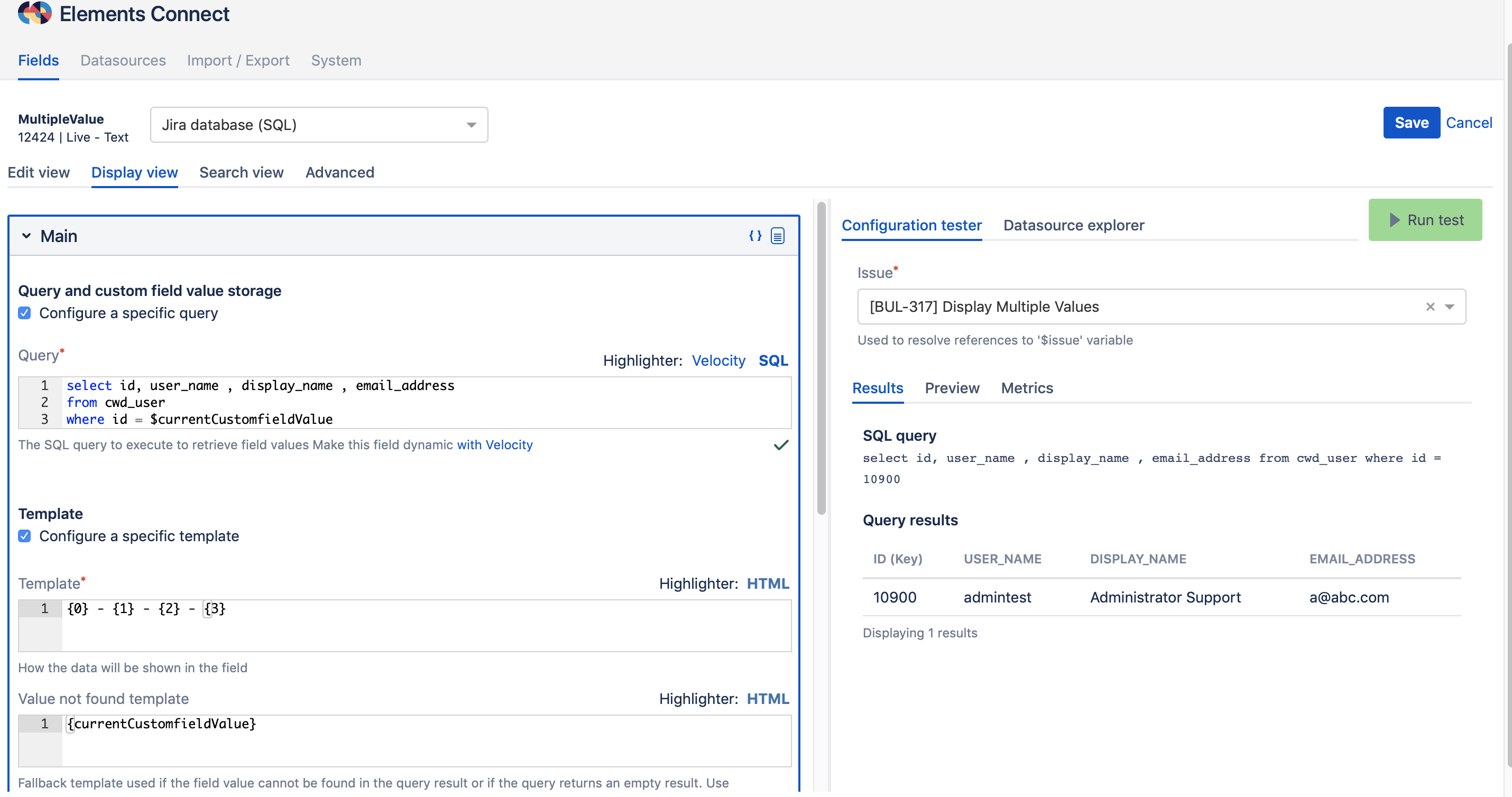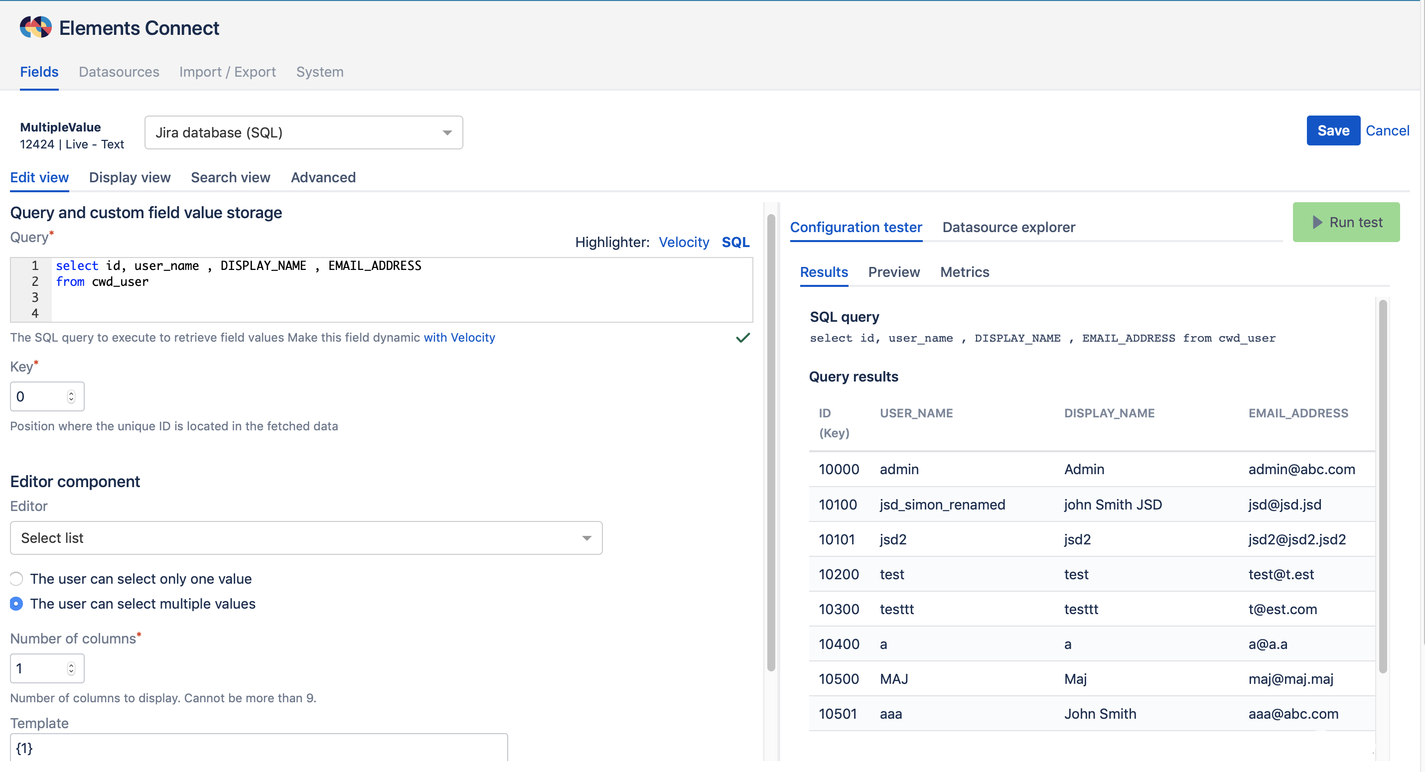 Suppose we have a user picker Elements Connect field, Live Text type plugged on Jira SQL datasource.