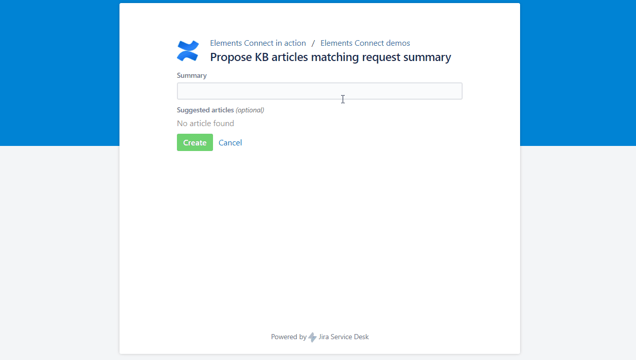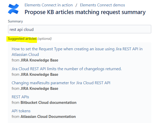 Dynamically lists Confluence pages articles matching the content of the "Summary" field as the user types.