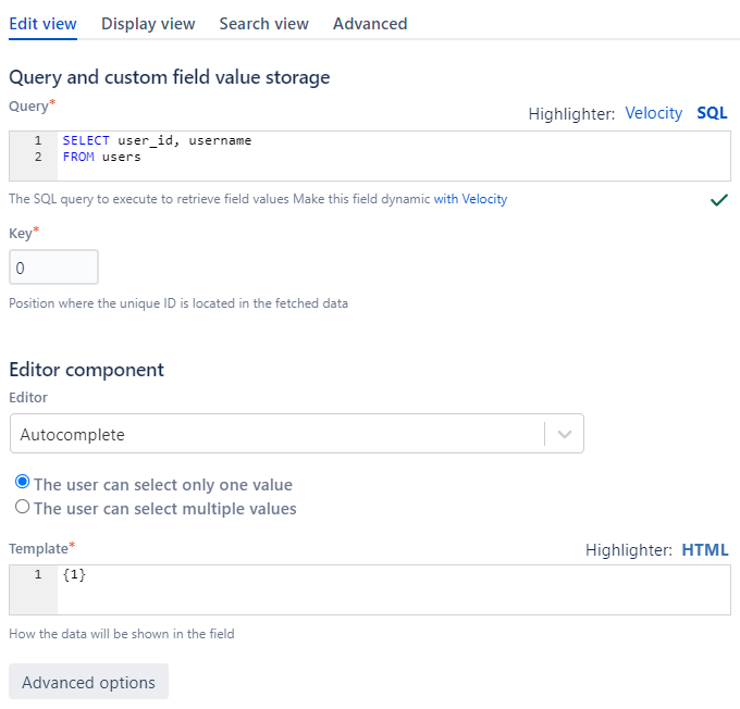 CODE#if($currentCustomfieldValue.size() > 0) SELECT user_id, username FROM users WHERE user_id = $currentCustomfieldValue #else $query.abort() #end