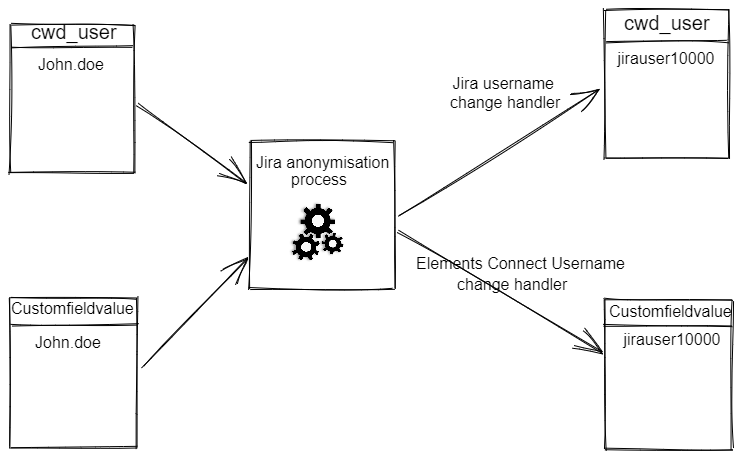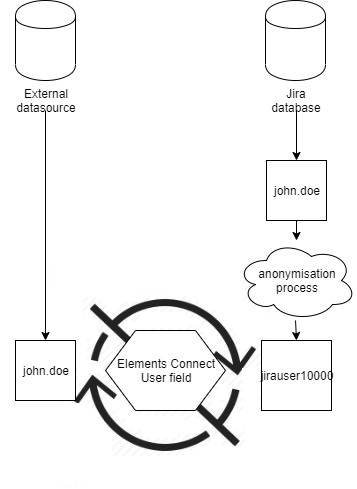 Elements Connect stores Jira username in customfieldvalue table of the inner Jira database. When Jira performs an anonymisation of a user, Jira only modifies data in cwd_user table. Nevertheless, we add an extension point (available from Elements Connect 6.1.8) which anonymises username stored in customfieldvalue table. You don't have to do something special, this extension point is executed during Jira anonymisation procedure. Here a scheme to help you understand anonymisation process: