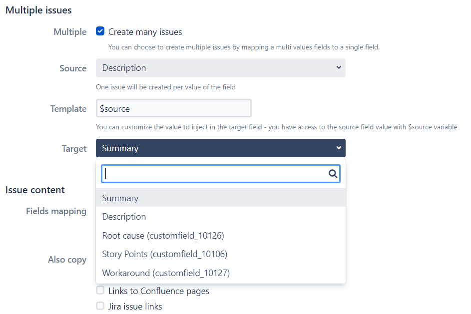 - Links to Confluence pages : choose whether to copy the existing Confluence pages links from the source to the newly created issue