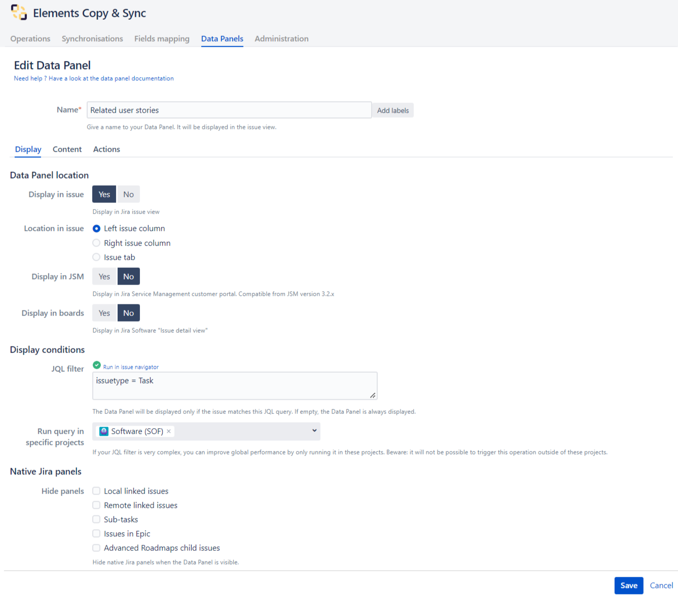 In this tab, you can configure the display options for your data panel : name, issue view position, visibility in JSM Customer portal and Agile Boards and display conditions.
