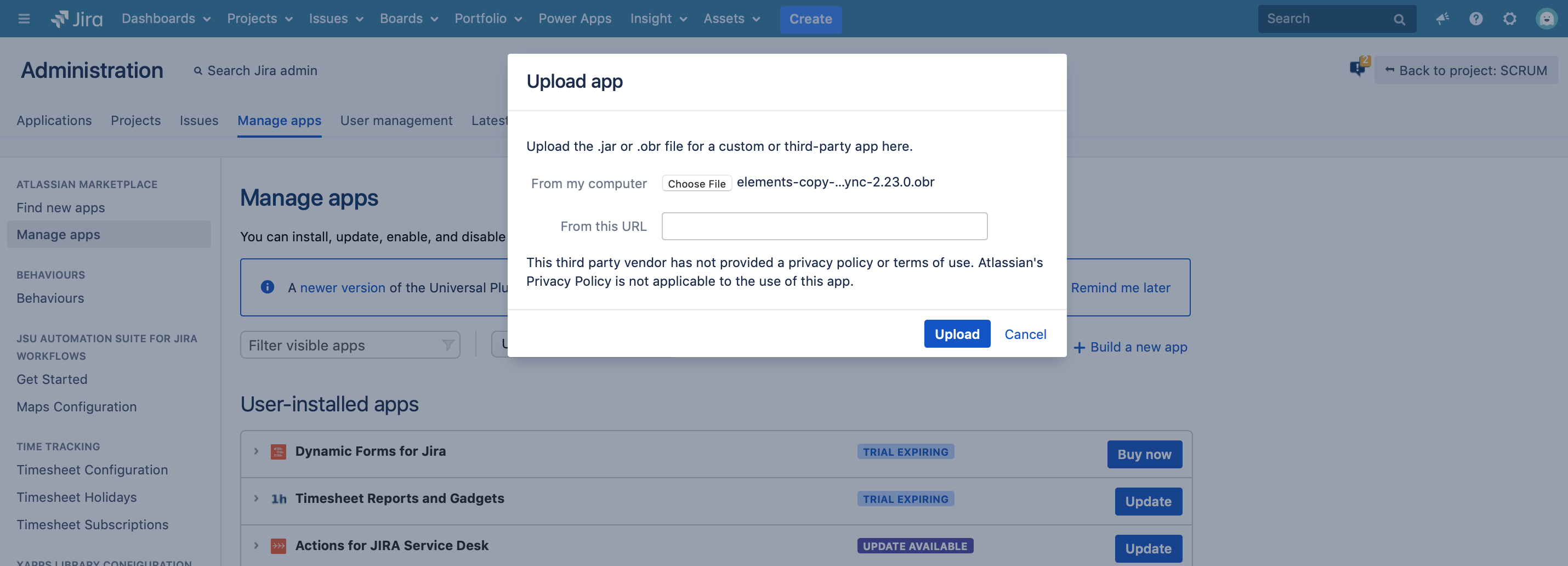 - In the JIRA Administration menu, select Manage Add-ons, then to install the Elements Copy & Sync file.