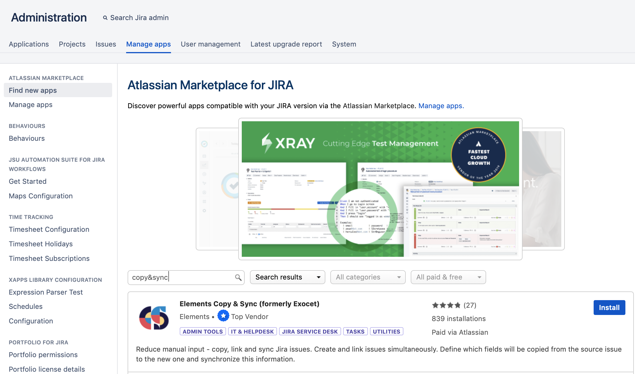 - In the JIRA Administration menu, select Find New Add-ons and search for Elements Copy & Sync