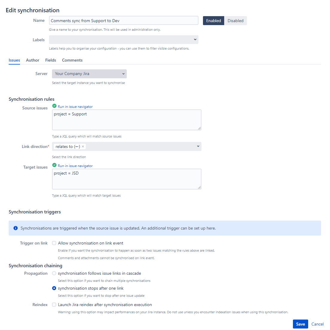 Reindex : if you encounter Jira indexation issues when this Copy & Sync synchronisation is enabled, check this option to force the reindex of the updated issue each time the synchronisation is performed.
