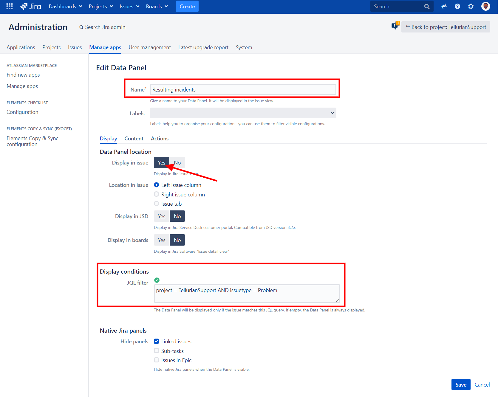 In our example, we want the Data Panel to appear only in the "Problem" issues of our project "TellurianSupport", where we want the JSM agent to be able to visualize and create links between issues.