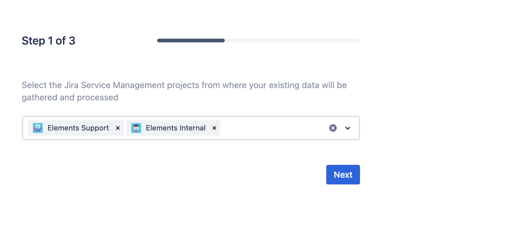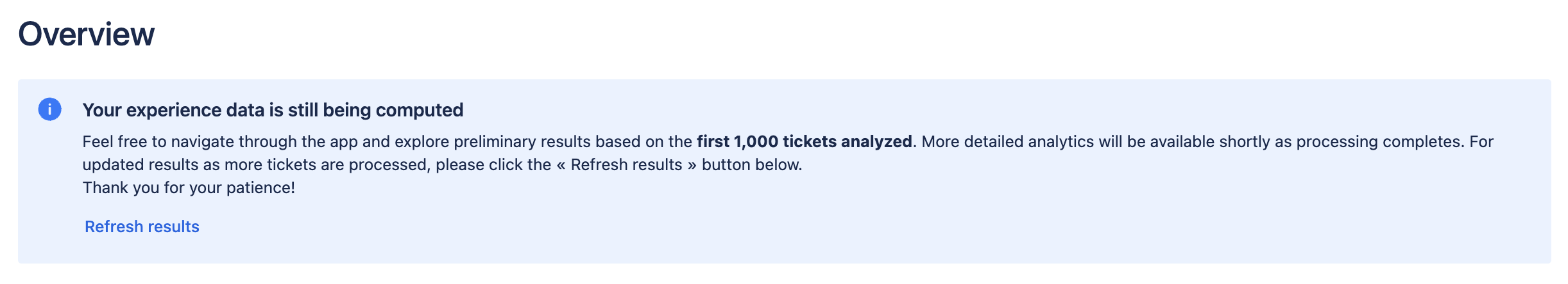 Following those steps, you have launched the analysis of your JSM projects data. Please note that we need a average loading time of 30 seconds to compute a preview of your results, based on your last 1000 requests created.