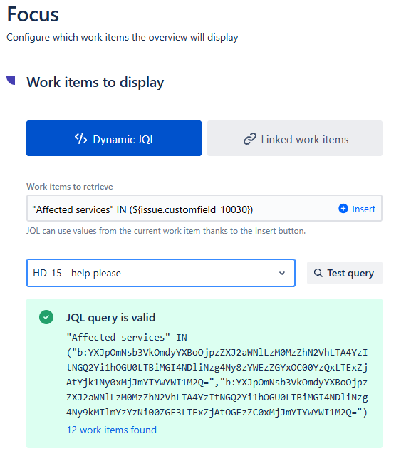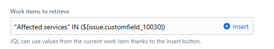 In order to pull work items with the same Affected services as the current work item, you’ll need to choose the “Dynamic JQL” mode.