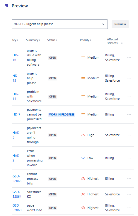 Display work items with the same affected services within the current work item. This enables agents to quickly spot related incidents or patterns and respond more efficiently.