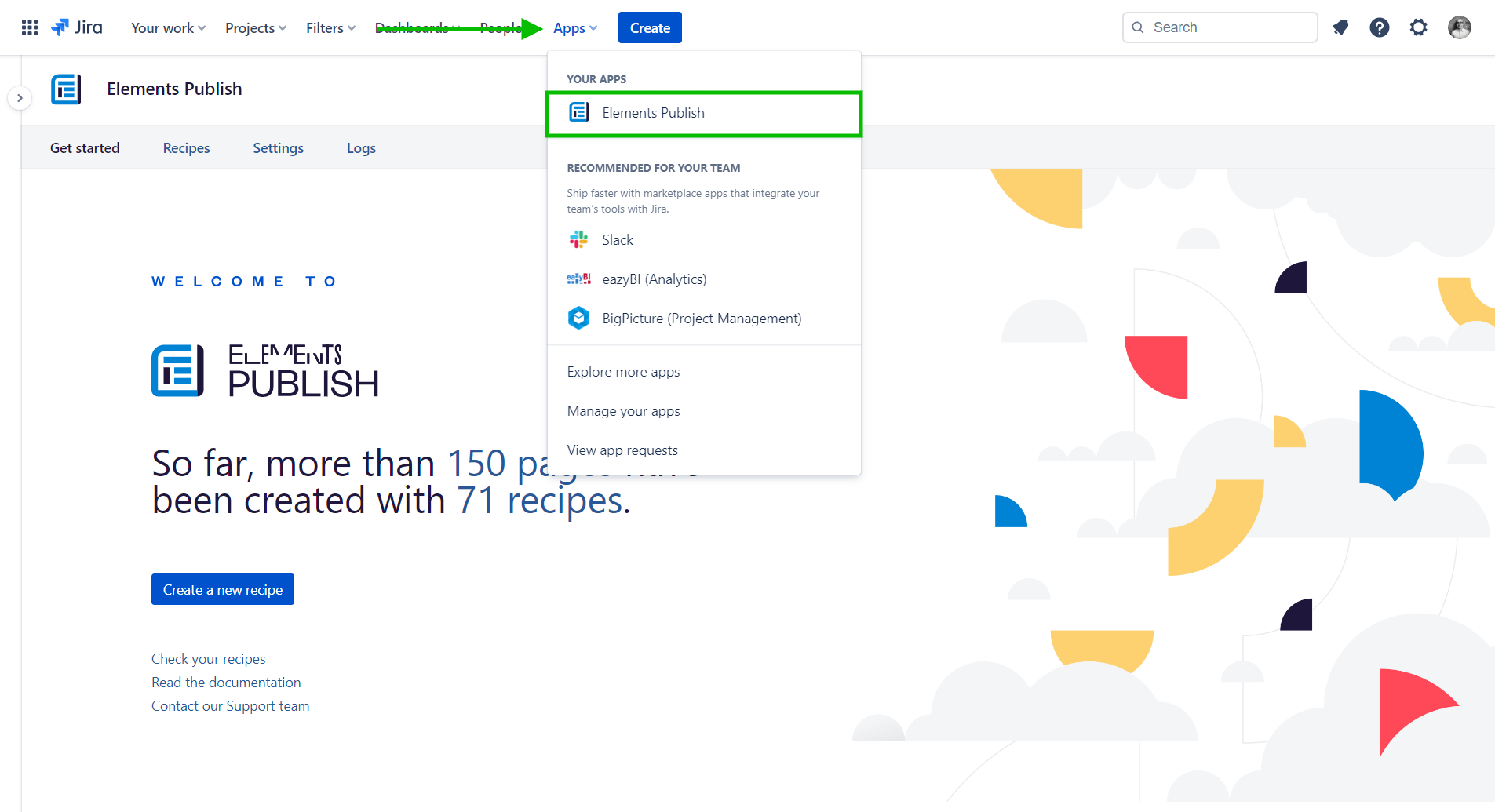 The app configuration page can be accessed from anywhere on the Jira Cloud instance, by clicking on the Apps button in the top menu, and then selecting Elements Publish to Confluence.
