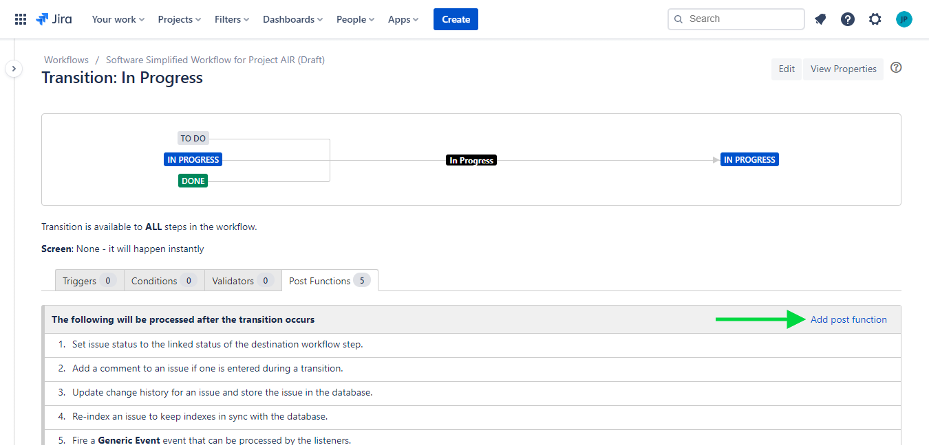 3 - In the diagram view, click on the "In Progress" transition. Then, click on Post-functions.