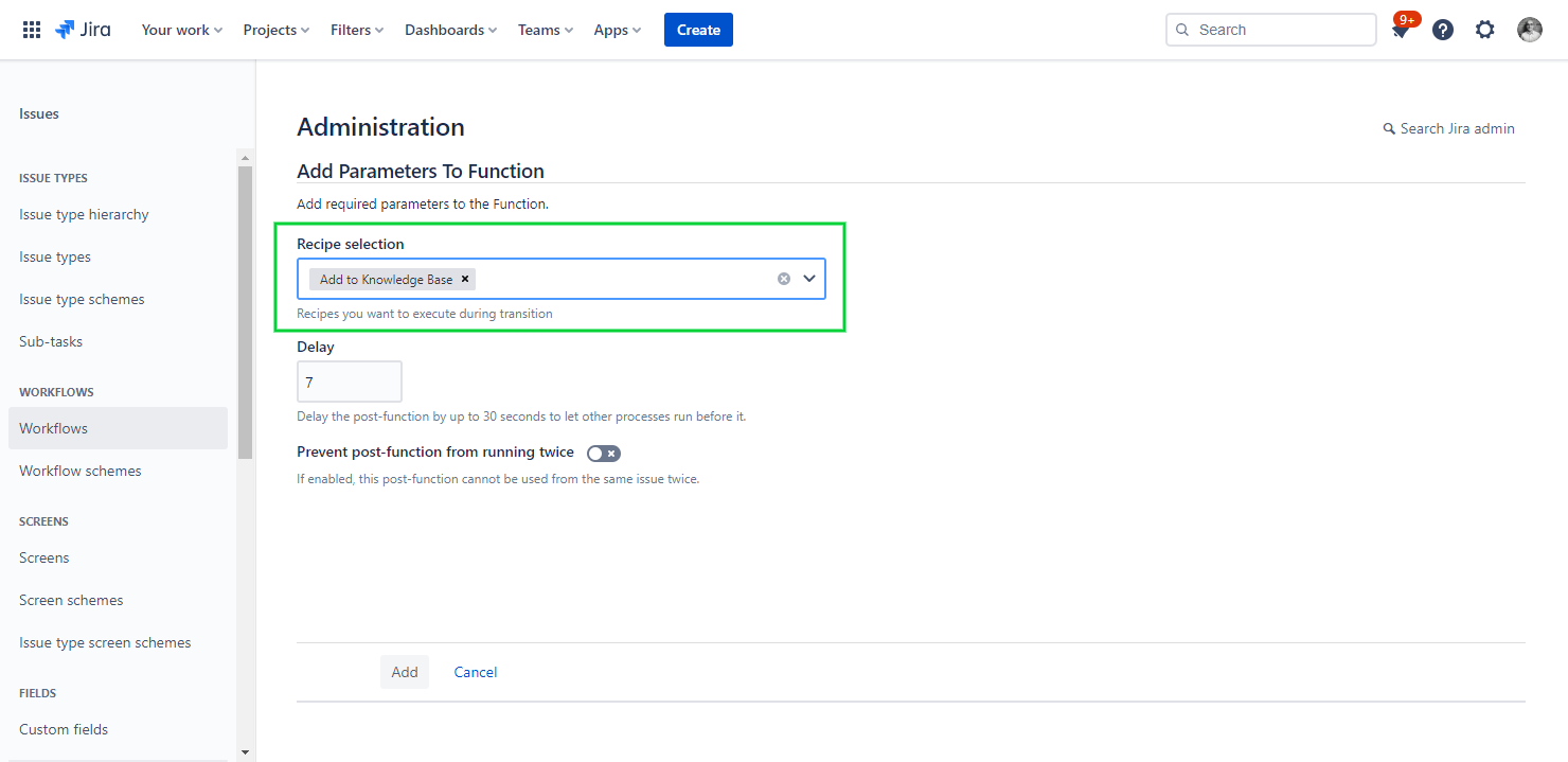 6 - Select the recipe "Add to Knowledge Base" and add it to the post-function.