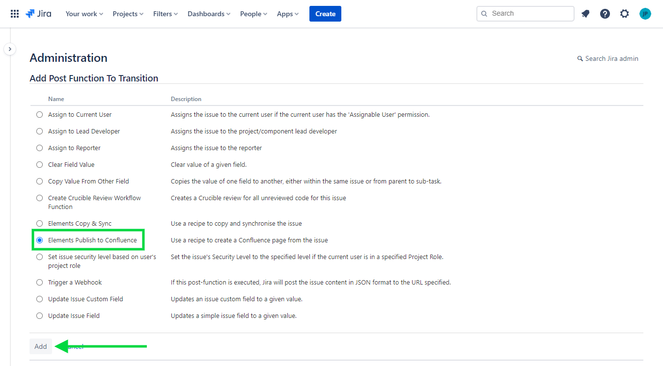 5 - Select the Elements Publish to Confluence option, then click on the Add button.