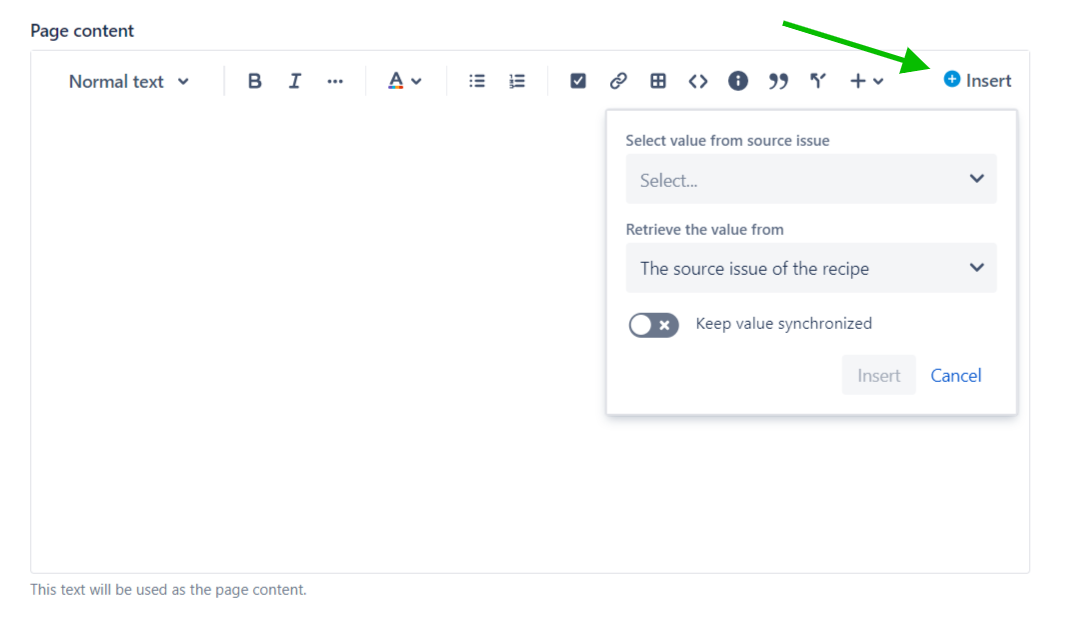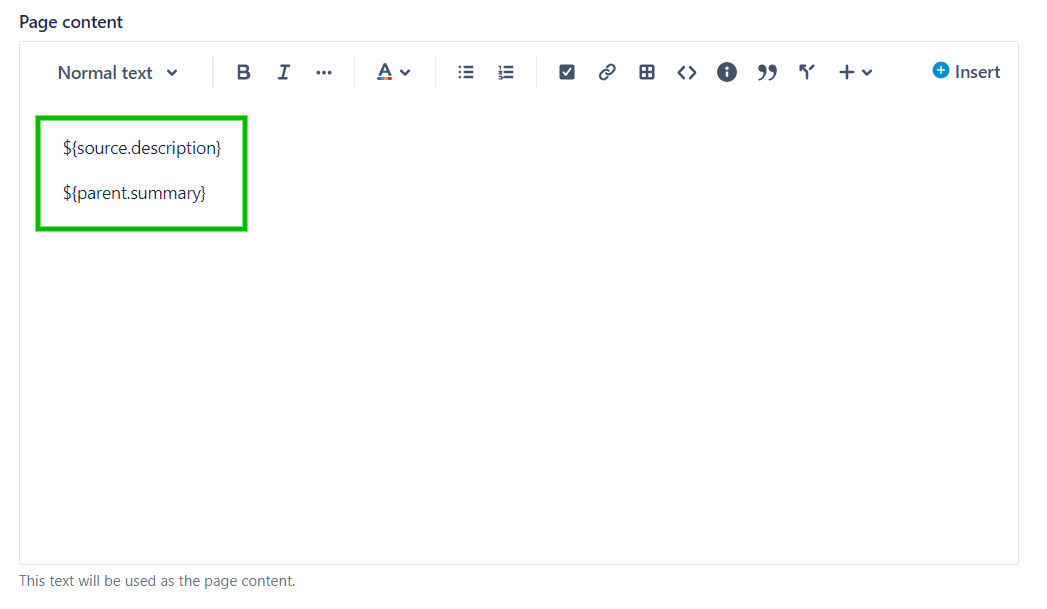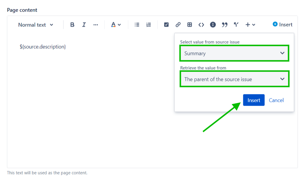 5 - Use the Page content text area to add the Description from the source issue and the Summary from its parent issue. This is done by clicking on the Insert button of the Page content field.