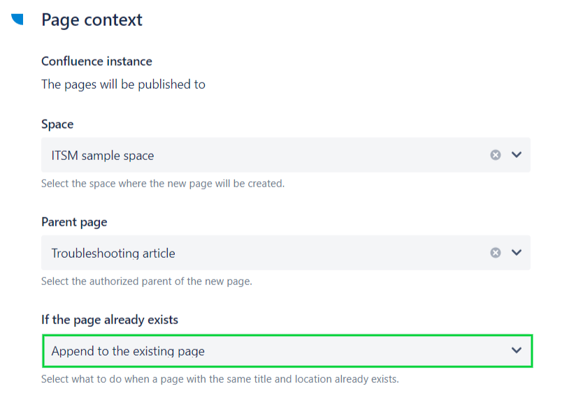 4 - In the "Page context" section, use the If the page already exists option to select the Append to the existing page behavior.