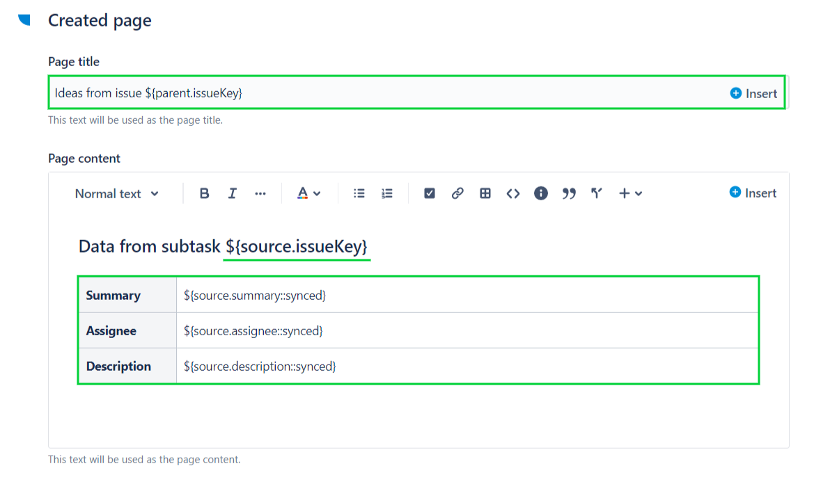 With this configuration, each time the recipe is triggered from a subtask of the same issue, the same page in Confluence will be updated and new content will be added to the bottom of the page with data from the subtask.