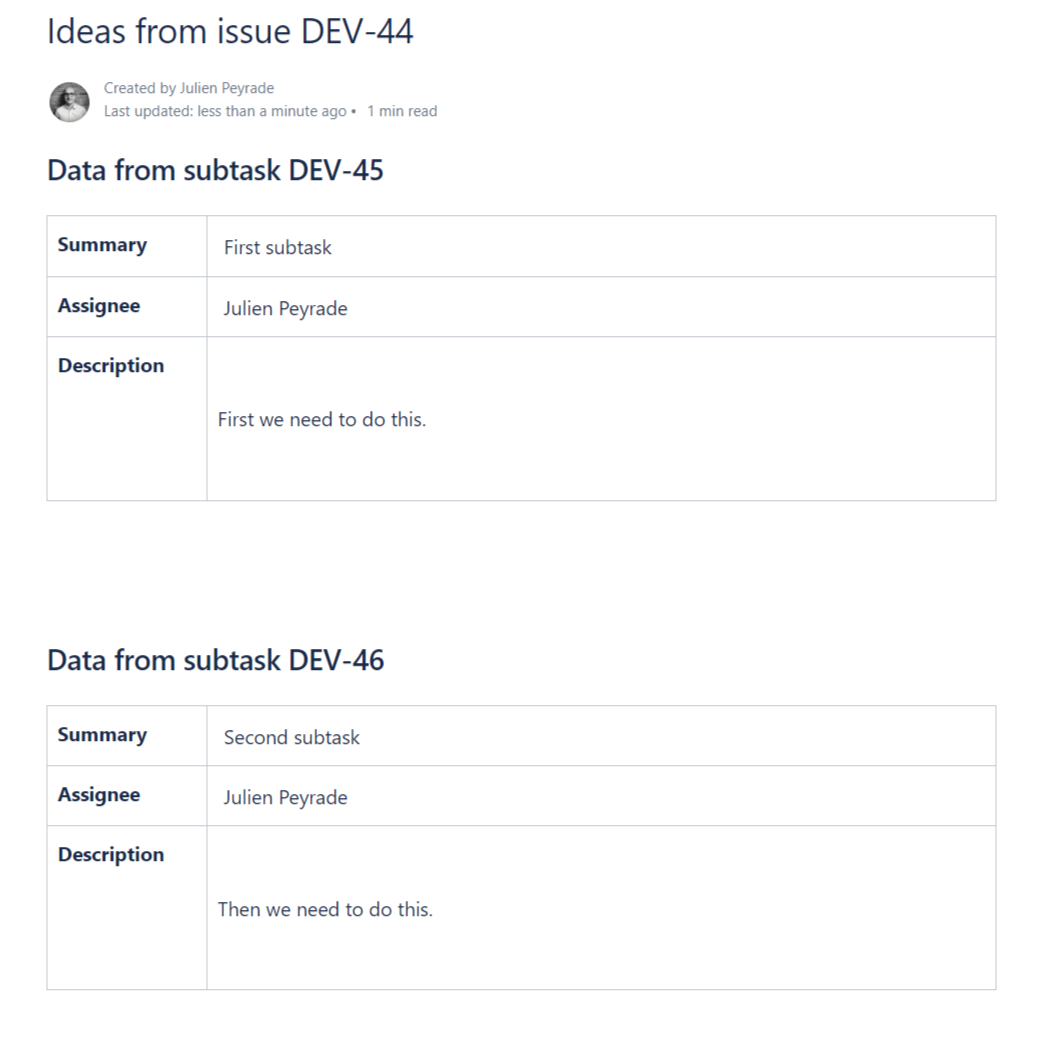 This guide explains how to insert data from all the subtasks of an issue in the same Confluence page with the same format, and how to keep this data up-to-date.