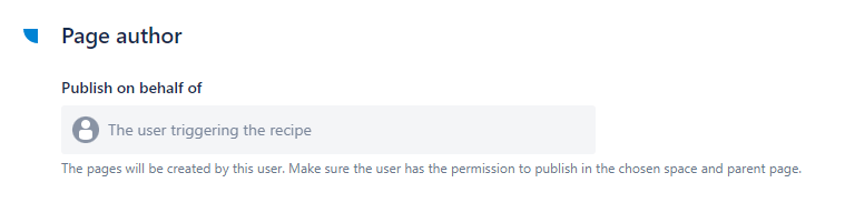 By default, pages are created by the user who triggers the recipe (either manually or through a post-function). This means that if this user has no permission to publish to Confluence or to access a given space or parent page in Confluence, they will not be able to create a page. By selecting a user with the appropriate permissions with this option, you can make sure that the recipe can always be successfully executed.