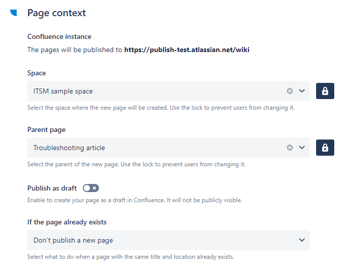 When unlocked, the target spaces and parent pages available to the user will strictly follow Confluence permissions. This means that if a user has no permission to see a space or a page, the space and page will not be visible in the Elements Publish user interface, and the user will not be able to publish a new page there.
