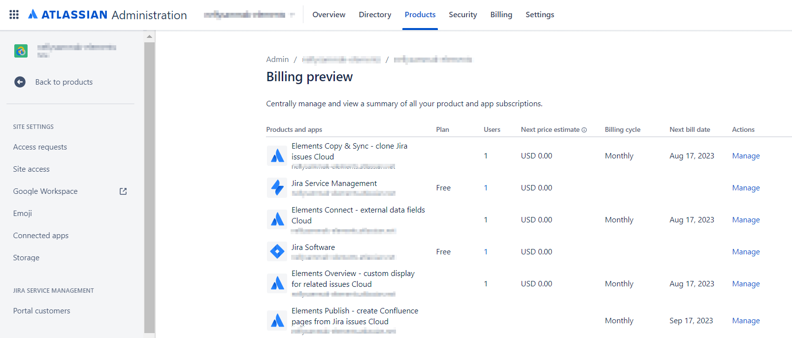 In Billing Preview, select the product you are using, e.g. Jira, and press the Manage link: