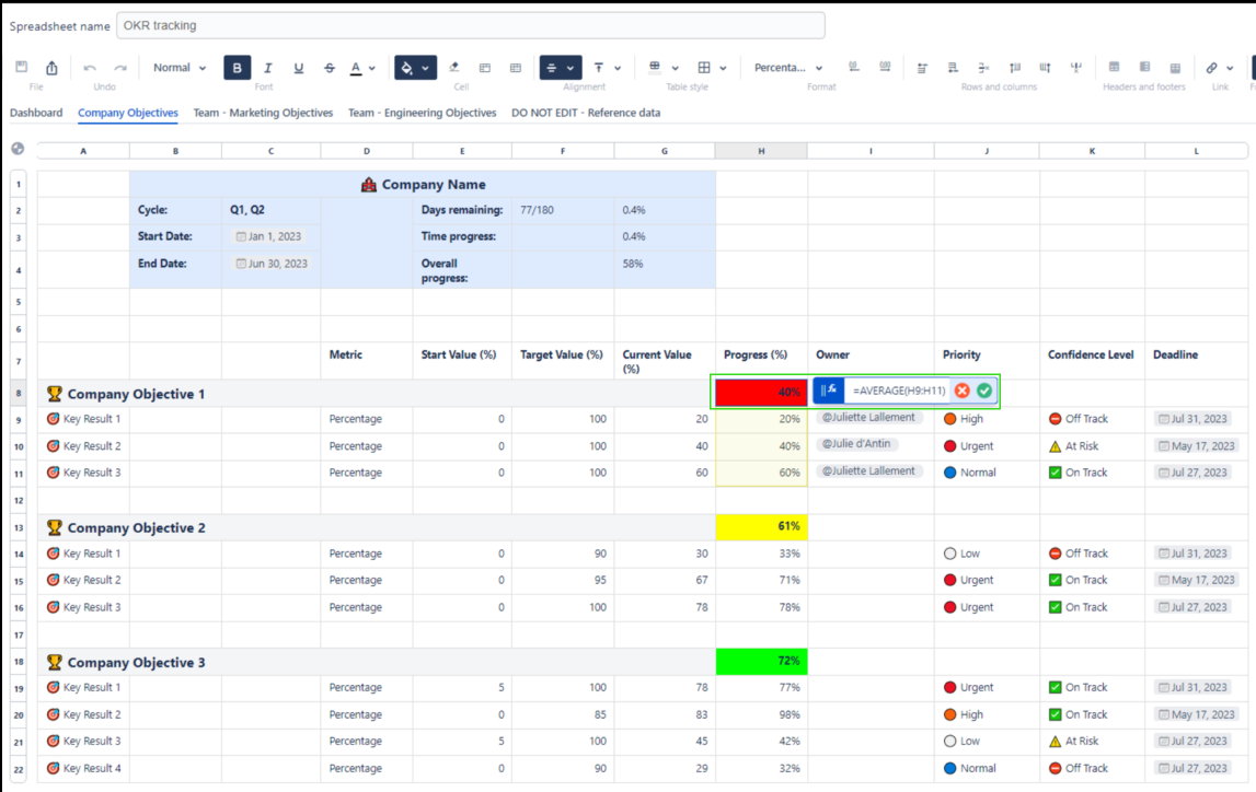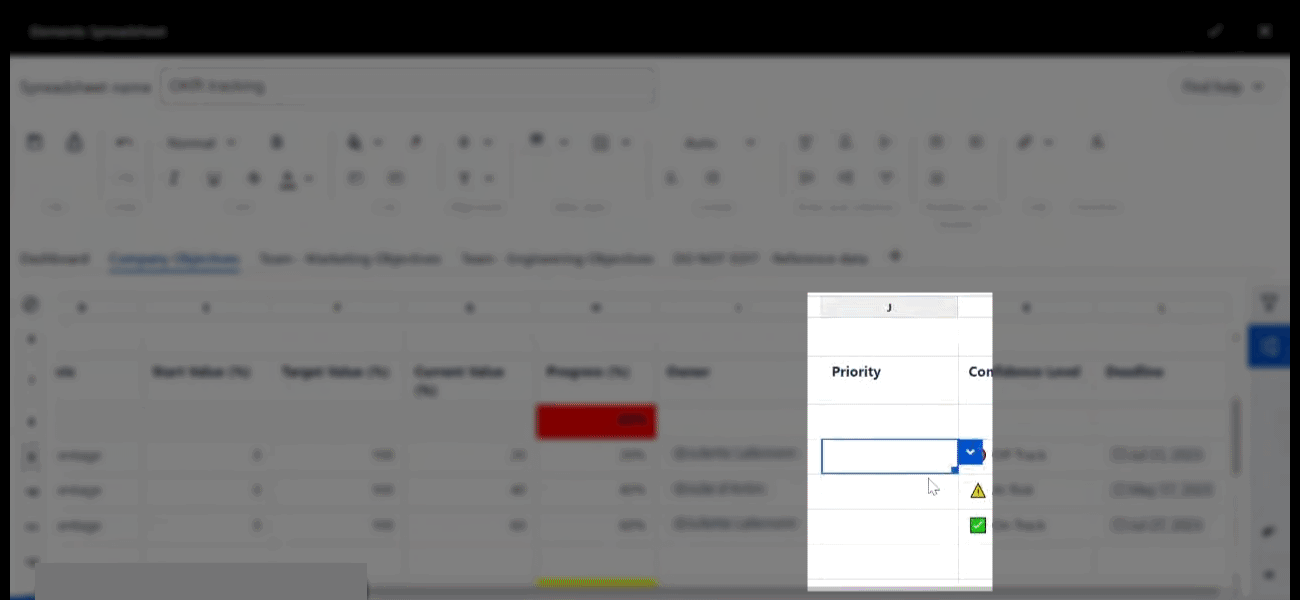 You may help teams focus their energy on top-priority goals by assigning relevant priority levels to them and their underlying key results. This can be easily achieved by adding data validation to a Priority column as shown below: