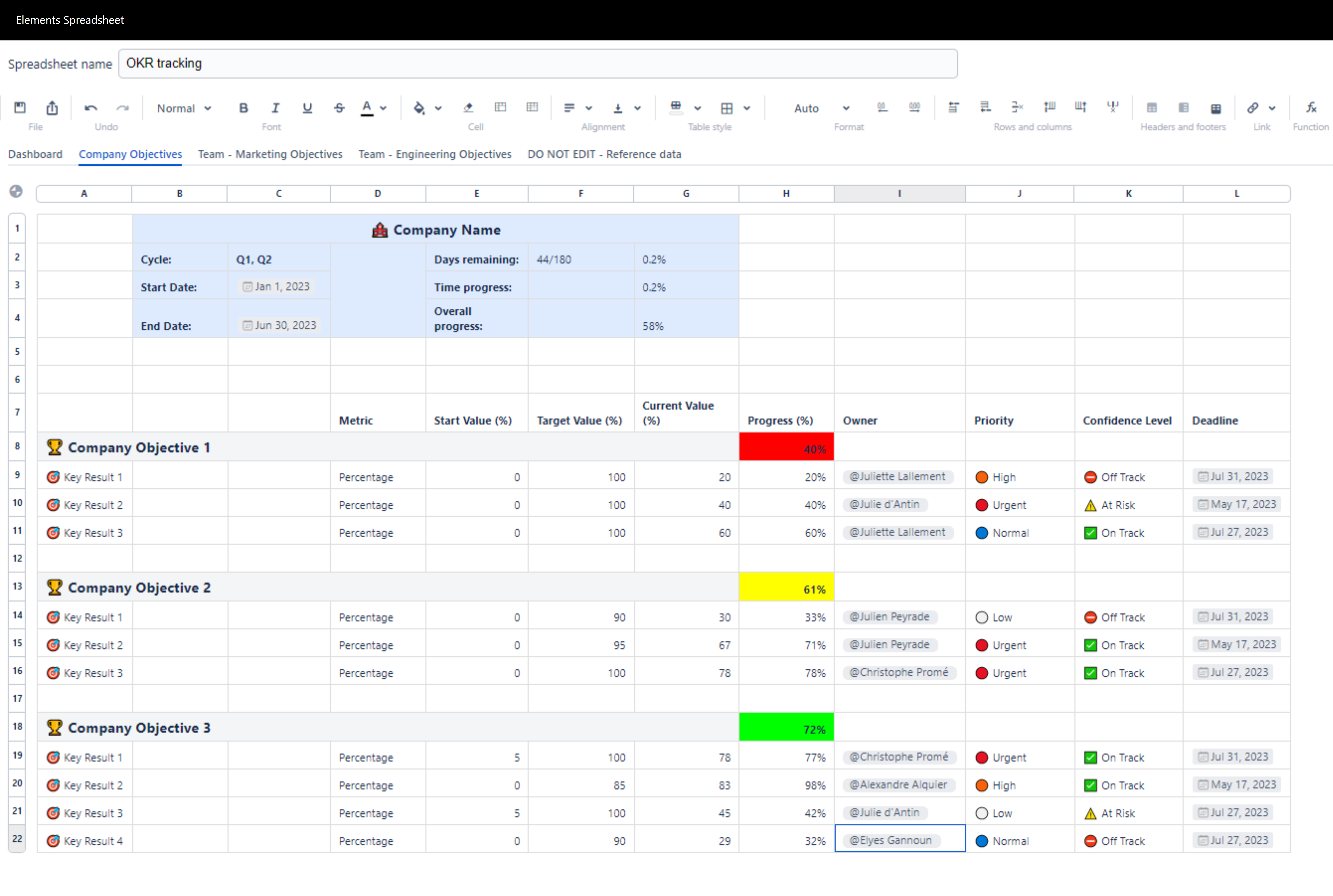 Elements Spreadsheet allows you to summarize teams' OKRs in a simple “executive summary” dashboard tab:
