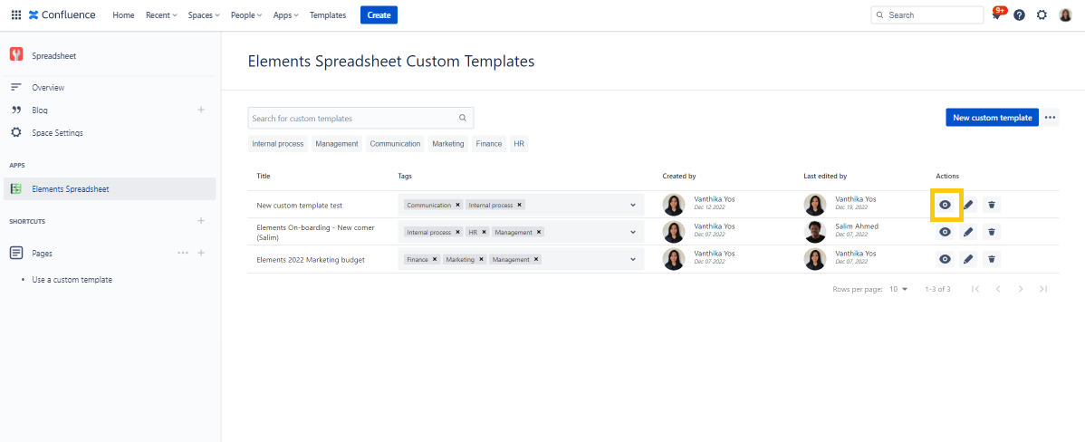 To view a custom template, you need to have at least the "Read" right access. Click on the eye icon to open the custom template in the full-screen edition macro in a read-only mode.
