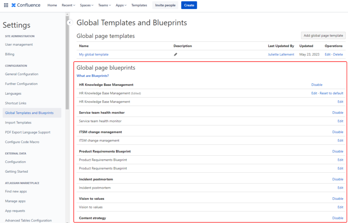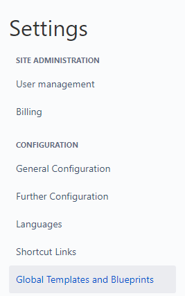 From the "Global Templates and Blueprints" administration page, global blueprints installed on the Confluence are displayed.