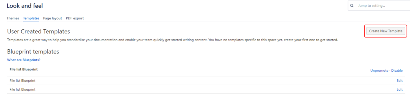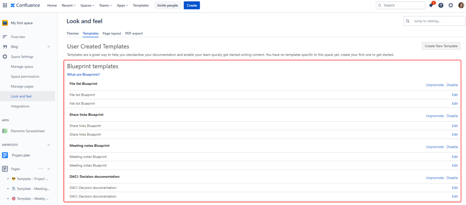 From the "Templates" section under the "Look and feel" administration page of your space, blueprints enabled for the space are displayed.