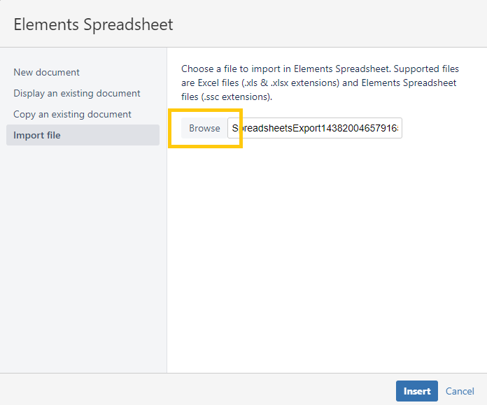 - On-premise: From the macro creation, select "Import file". Click on the "Browse" button to select your Excel document on your computer. Finally, click on the "Ok" button to start importing your document. Once the import is finished, your document is ready to be edited in the Spreadsheet editor.