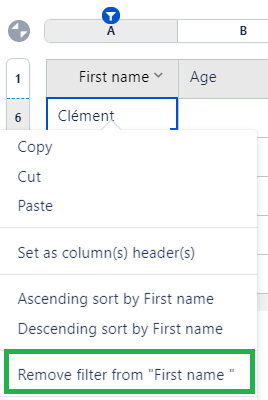 Right click on a cell in the column name to display the menu then select "Add filter on Column name" to directly create a filter on the corresponding column.