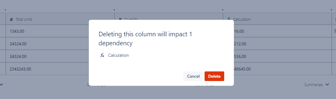 Note that a warning will pop up if you attempt to delete a column that is being referenced by another column, typically a Calculation-type column. Ignoring it and deleting the column anyway will cause the impacted dependency to error out.