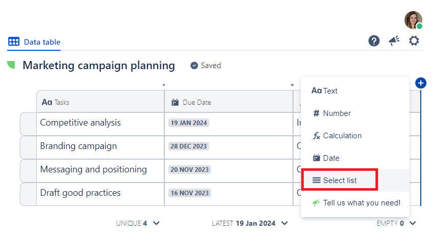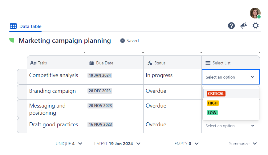 Select list columns are great when you need to select a single option from a pre-set list of options. Using Select list columns is particularly useful in project management, when you want to record severity levels, priority levels, or statuses for example.