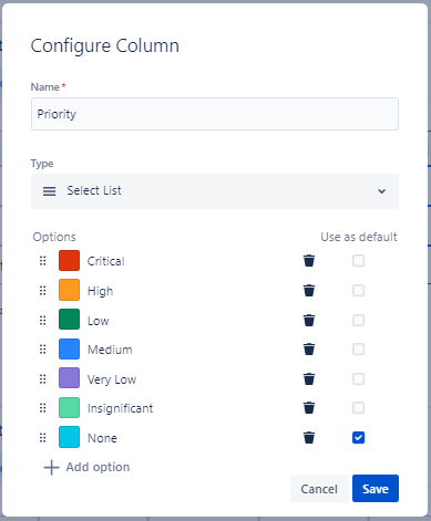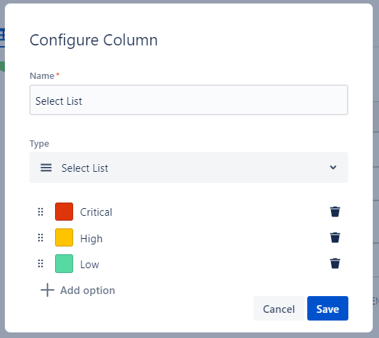 To change the configured options, simply access the column dropdown menu and click "Configure Column". The configuration dialog will display and you will be able to edit option names as well as colors assigned to them.