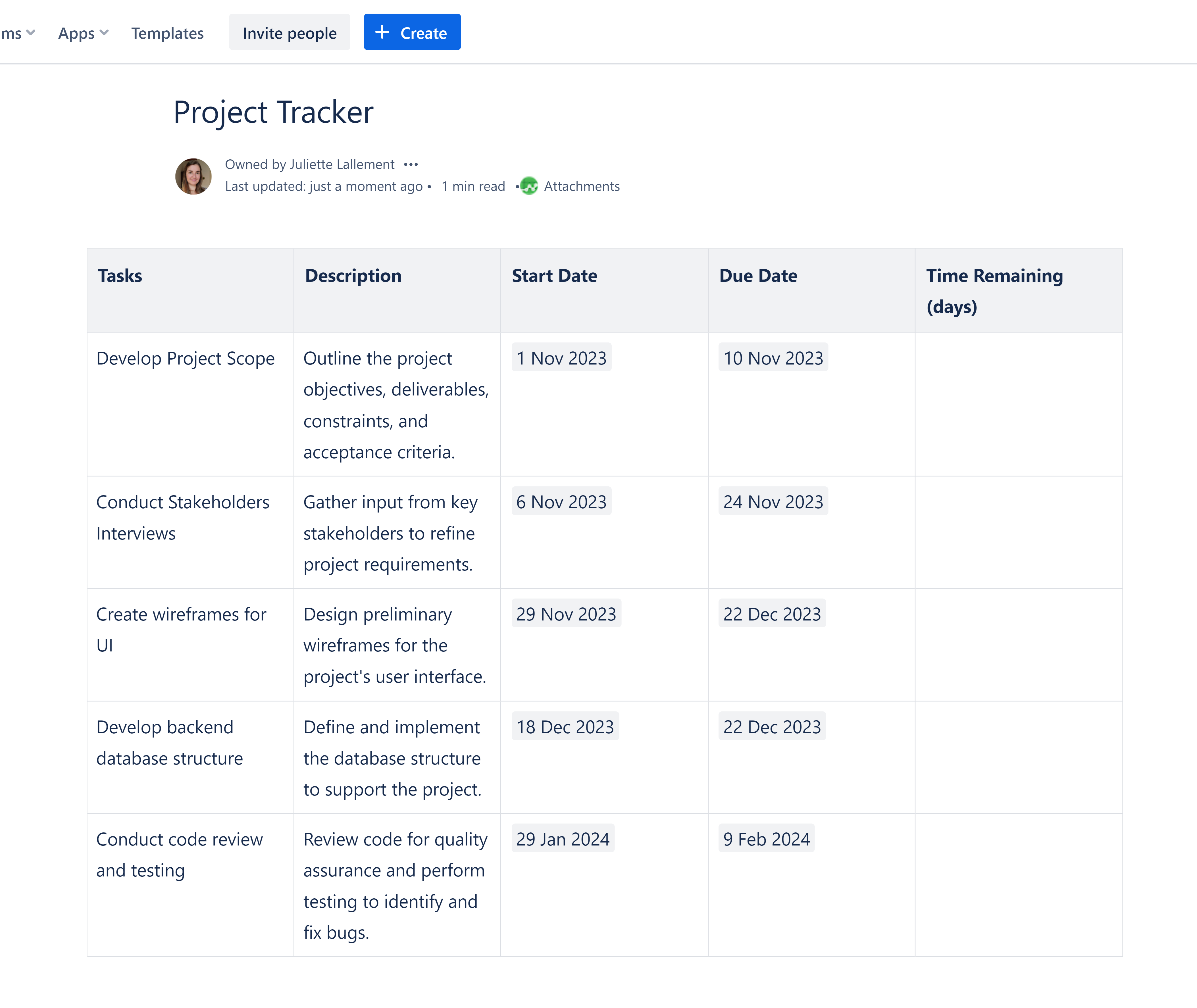 As part of their daily project reporting in Confluence, Project Managers would typically use native Confluence tables to manually report on the time remaining for each project task.